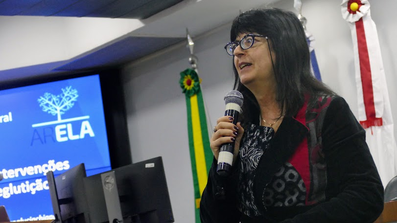 “Fonoaudiologia na ELA - Intervenções para comunicação e deglutição” foi a palestra da Dra. Ana Lúcia Chiappetta, fonoaudióloga clínica, especialista em motricidade orofacial pelo CFFa (SP). A partir da constatação que a ELA compromete os músculos da língua, a Dra. Ana Lúcia Chiappetta expôs que as principais manifestações são disfagia, disartria, disfonia, dispneia e distossia. Também mostrou que a respiração e a deglutição estão relacionadas e as formas de trabalhar a mecânica respiratória.