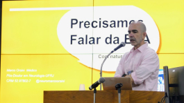 O tema da primeira palestra foi “Registro epidemiológico - Importância dos dados para políticas públicas e pesquisa”, com o Dr. Mário Emílio Teixeira Dourado Jr., médico neurologista e coordenador do Ambulatório de Doenças Neuromusculares do HUOL/EBSERH (RN). Ele ressaltou que ainda há poucos estudos sobre a ELA no Brasil e apresentou os dados disponíveis até o momento. Eles indicam que o tempo médio de diagnóstico da doença no país é de 14 meses e que há subnotificação de casos. Por isso, reforçou a importância do Registro Nacional/Estudo Epidemiológico de ELA, disponível para preenchimento pela internet.